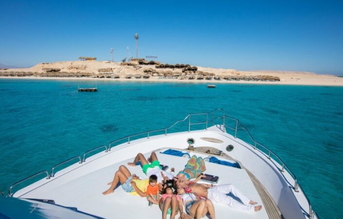 Your adventure begins with a convenient pick-up from your hotel in Hurghada or El Gouna by a friendly and professional guide. You’ll be comfortably transferred to the marina, where your well-equipped boat awaits. As you board the spacious and stylish vessel, you’ll be greeted by the crew and introduced to the facilities onboard—shaded areas, sun decks, restrooms, and refreshments to ensure a smooth and relaxing journey. Once everything is ready, you’ll set sail across the crystal-clear waters of the Red Sea toward the stunning Mahmya Island.